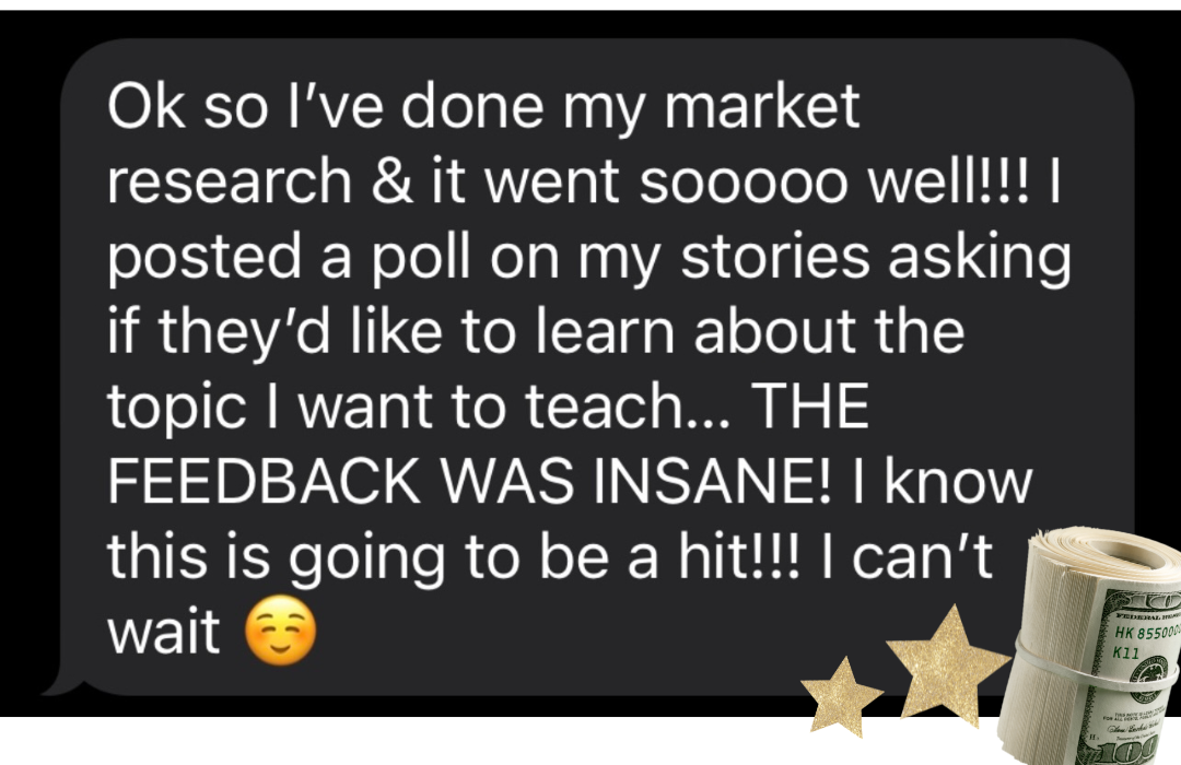 I teach you how exactly to find your dream student, their desire, the transformation they seek and most importantly how to reach them with your content. I call this market research and it's detailed in the course!